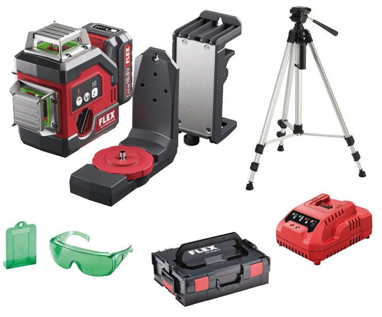 Flex ALC 3/360-G/R 10.8/2.5 Ah Set akkus kompenzátoros keresztvonalas lézer, zöld + LKS 65-170 F 1/4" lézerstatív (1 x 2.5 Ah Li-ion akkuval, L-BOXX-ban) *